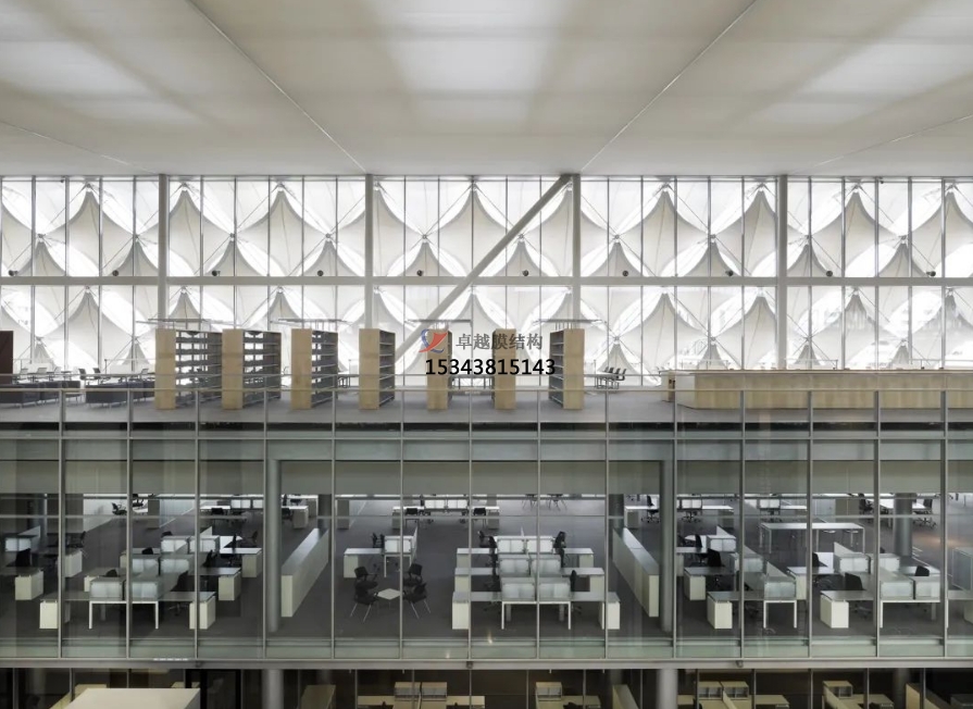 膜結(jié)構(gòu)頂棚是一種現(xiàn)代化的建筑形式,利用高強(qiáng)度柔性薄膜材料與支撐體系相結(jié)合,形成具有一定剛度和獨特曲面的覆蓋結(jié)構(gòu)。這種結(jié)構(gòu)不僅美觀大方,而且具有良好的透光性和節(jié)能效果,適用于各種公共建筑,包括圖書館。