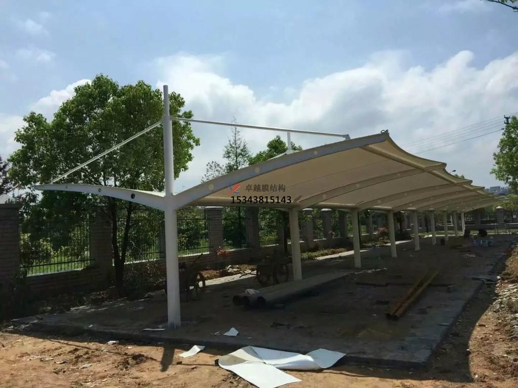 種,張力式膜結(jié)構。這種類型的膜結(jié)構是采用相對簡單的材料制作而成的,同時由于這種膜結(jié)構本身具有一定的張力,因此稱為張力式膜結(jié)構。與傳統(tǒng)的膜結(jié)構有所差異的是,主要有兩種柔性材料構成它的受力材料,即薄膜和索。在對膜結(jié)構進行工程設計之前我們必須先要了解一下它的組成材料,一般來說,使用在建筑工程上的薄膜材料主要有織物類以及非織物類兩種。前者比較常用的一般主要是PVC膜材以及PTFE膜材,而比較常用的ETFE膜材是在在所有非織物類的薄膜材料中具有代表性的。而不同場地使用的停車棚因為其要求也不同,所以對選擇的膜結(jié)構的功能以及設計壽命都有所區(qū)別。