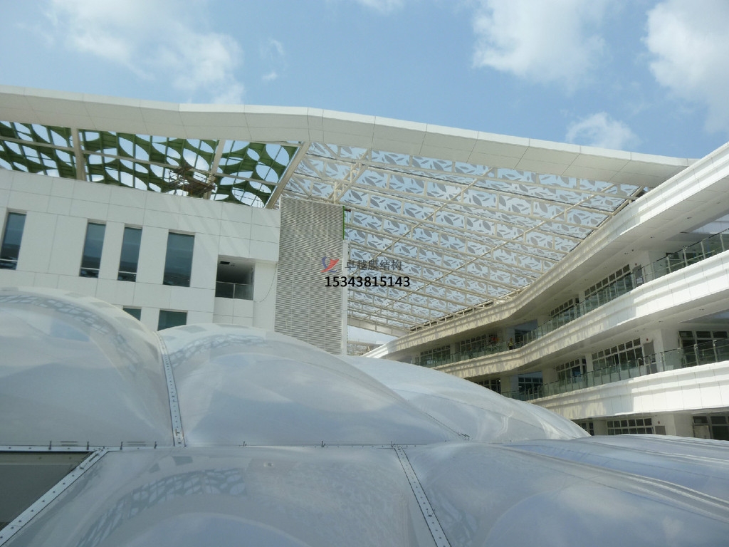也不是所有的建筑都需要透明,或許只需要采光好半透明這種材料就可以滿足了,ETFE膜材就根據(jù)不同的建筑需求可以定制不同透光率的ETFE膜材料。無論你的設(shè)計(jì)需求是什么,我們中衛(wèi)ETFE膜結(jié)構(gòu)建筑的透光性可以滿足您對采光這方面的需求。