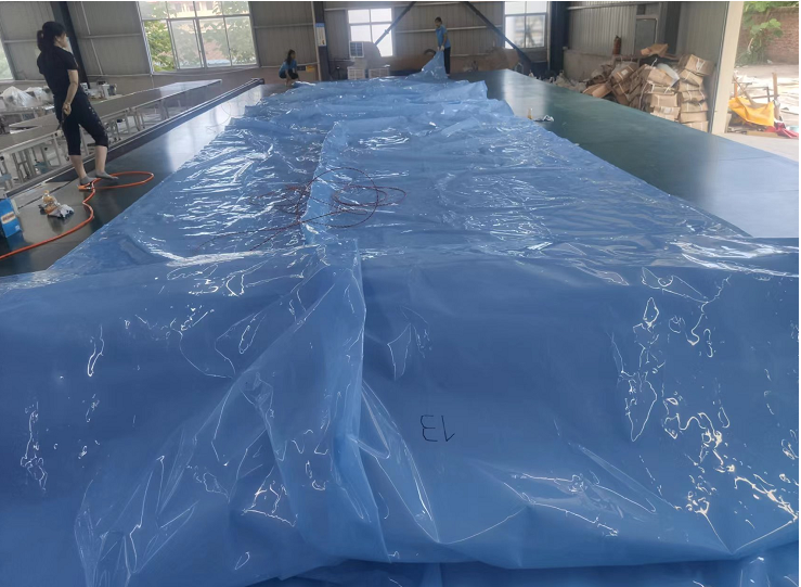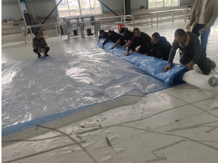焊接完成,人工收卷,200平方一個氣枕,用了8個才卷起來。