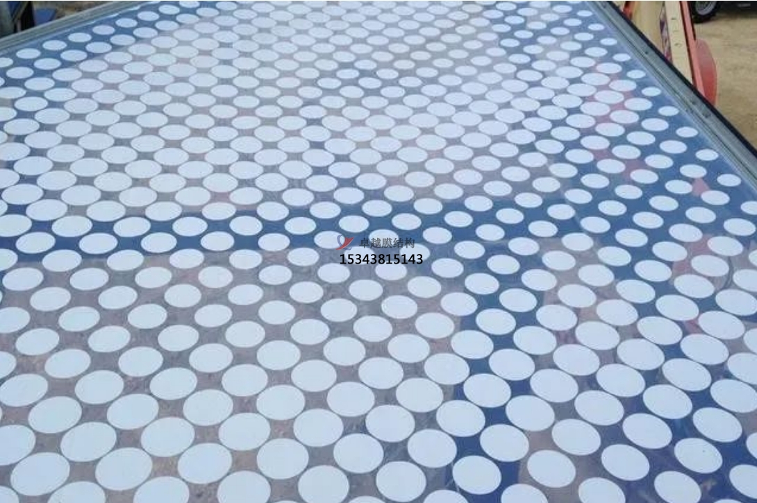 ETFE薄膜不僅具有優(yōu)良的抗沖擊性能,熱穩(wěn)定性能及耐候性,自清潔性,耐化學(xué)腐蝕性能,且重量只有同等面積玻璃的1%。 印刷ETFE膜材最常用的圖案是圓形銀點(diǎn),由于銀對(duì)太陽輻射的反射,印刷面積的百分比根據(jù)太陽熱增益因子的要求進(jìn)行評(píng)估。