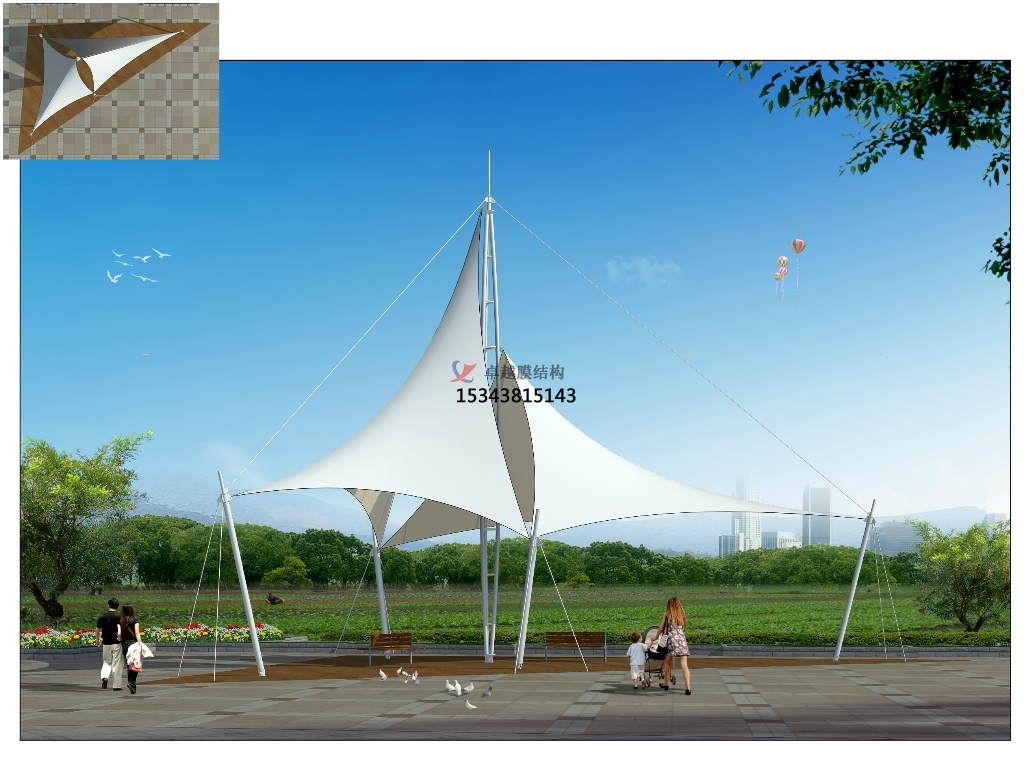 6、景觀設(shè)施:膜結(jié)構(gòu)以其特殊的建筑表現(xiàn)手法,主要體現(xiàn)在造型、漫射透光性、豐富多彩,可廣泛應(yīng)用于入口、標(biāo)志性小品 、步行街、停車(chē)場(chǎng)等,其他建筑特性無(wú)須較高要求。