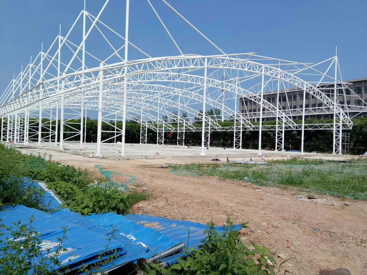 籃球場膜結(jié)構(gòu)工程施工流程與關(guān)鍵技術(shù):其流程包含支撐結(jié)構(gòu)安裝(以鋼結(jié)構(gòu)為例)、膜材加工與安裝、 膜面張拉與調(diào)整、節(jié)點處理與防水密封。在關(guān)鍵技術(shù)點中,支撐結(jié)構(gòu)的安裝涵蓋構(gòu)件吊裝,按施工順序吊裝鋼柱、鋼梁,使用經(jīng)緯儀和水準儀控制垂直度和標高,臨時固定后進行焊接或螺栓連接。焊工需持證上崗,焊接前清理焊口,采用多層多道焊,焊后進行焊縫探傷檢測(如超聲波檢測),確保焊接質(zhì)量。焊接部位及損傷的防腐層需重新涂刷防銹漆和面漆,涂層厚度符合設計要求。膜材加工與安裝,膜材的加工需要根據(jù)深化設計圖紙,在工廠內(nèi)對膜材進行裁剪、熱合(或縫合),形成完整的膜單元。加工完成后進行預拼裝(預張力測試),檢查膜面尺寸、形狀是否符合設計要求,記錄膜材的張拉方向和定位標記。然后進行膜材吊裝,采用多點吊裝法,使用專用吊具(如尼龍吊帶)避免膜材損傷,吊裝過程中需專人指揮,確保膜面平穩(wěn)展開。先將膜材邊緣與支撐結(jié)構(gòu)上的夾具臨時固定,再逐步張拉至設計位置。在膜面張拉與調(diào)整中,首先注意張拉順序,遵循 “由中間向四周” 或 “對稱張拉” 原則,分階段逐步施加預張力,避免膜面局部應力集中。然后是張力控制,使用張力計實時監(jiān)測膜面張力值,達到設計張力值的80%后暫停張拉,靜置24小時讓膜材應力松弛,再進行二次張拉至設計值。最后是形態(tài)調(diào)整,張拉過程中觀察膜面是否平整,有無褶皺或積水隱患,通過調(diào)整支撐結(jié)構(gòu)的位移或夾具位置優(yōu)化膜面形態(tài)。在節(jié)點處理與防水密封中,膜材與鋼結(jié)構(gòu)連接采用夾具固定(如鋁合金夾具),螺栓間距控制在200-300mm,確保連接牢固。膜材之間的拼接縫采用熱合焊接,焊縫寬度不小于50mm,焊接后進行氣密性檢測。最后進行防水處理,在膜結(jié)構(gòu)邊緣與建筑主體連接處設置防水卷材或密封膠,防止雨水滲漏。排水坡度需≥5%,確保膜面雨水能迅速排至天溝或地漏。