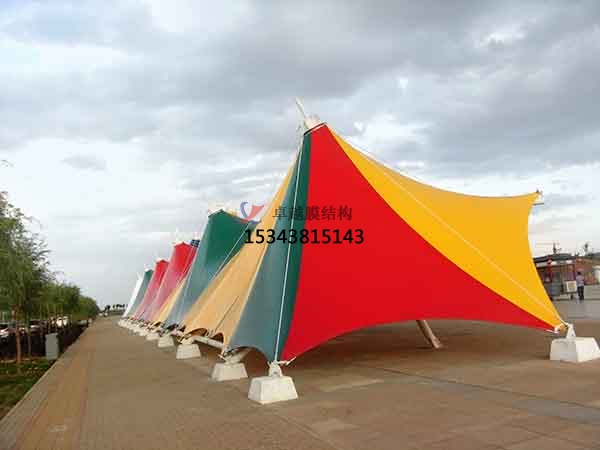 索膜結(jié)構(gòu)景觀棚建造要點(diǎn):其建造要點(diǎn)主要有材料的選擇、色彩與造型搭配、施工安裝。在材料的選擇方面,膜材的性能直接影響景觀棚的質(zhì)量和使用壽命,應(yīng)選擇具有高強(qiáng)度、耐候性好、透光性適宜、自潔性強(qiáng)等特點(diǎn)的膜材,如PVDF膜材、PTFE膜材等。同時(shí),對(duì)于支撐索、鋼桿、連接件等也需要選擇質(zhì)量可靠、耐腐蝕的材料。在色彩與造型搭配中,需結(jié)合周圍環(huán)境和使用需求,選擇合適的膜材顏色和景觀棚造型,使其與周圍環(huán)境相協(xié)調(diào),形成統(tǒng)一的景觀效果。顏色可以選擇鮮艷明亮的色彩,以突出景觀棚的標(biāo)志性和吸引力,也可以選擇與自然環(huán)境相近的色彩,以達(dá)到融合自然的效果。在施工安裝過(guò)程中需要嚴(yán)格按照設(shè)計(jì)要求和施工規(guī)范進(jìn)行操作,確?;A(chǔ)工程的牢固性、支撐結(jié)構(gòu)的安裝精度、膜材的張拉力度和安裝平整度等。同時(shí),要注意施工安全,做好現(xiàn)場(chǎng)的安全防護(hù)措施。