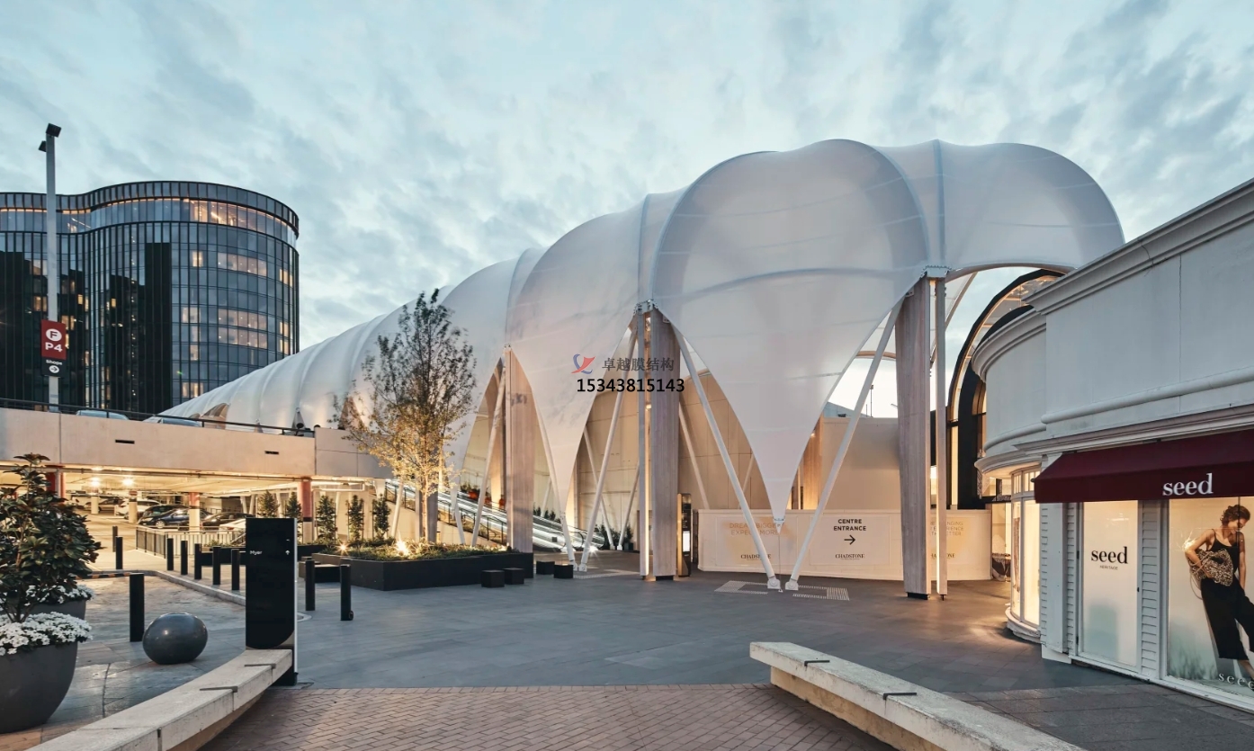 商業(yè)購物中心的主要特點(diǎn)是因商業(yè)店鋪的集中而形成了室內(nèi)室外購物、休閑、餐飲等功能空間,步行街及中央活動區(qū)域是人們行走、休息、交流的開放空間,基于商業(yè)街特色,就決定了所有設(shè)計(jì)的核心就是讓空間更具人性化。屋頂作為建筑附加設(shè)施,不僅要求遮陽避雨的實(shí)用功能,也應(yīng)該是錦上添花的設(shè)施。目前國內(nèi)外膜結(jié)構(gòu)應(yīng)用于商業(yè)綜合體的工程案例越來越多,膜結(jié)構(gòu)建造的屋頂擁有很多傳統(tǒng)屋頂所不具備的優(yōu)勢特點(diǎn)。