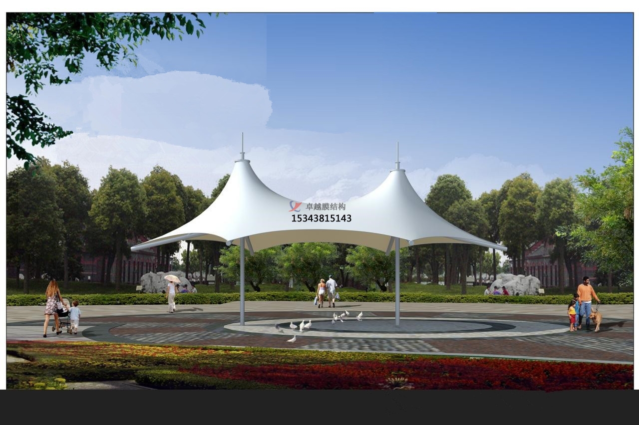 2、一個城市的中心區(qū)反映一個城市的地理風貌和民族風情,同時,也是一個城市文化發(fā)展程度的標志。而景觀設計要求其具有廣泛的可讀性、雅俗共賞,既有超凡脫俗的藝術價值,又能使大眾喜聞樂見與大眾息息相通。張拉膜以其輕盈飄逸的造型、柔美并帶有力量的曲線和大跨度和大空間的鮮明個性和標識性,應用于城市小品設計中。