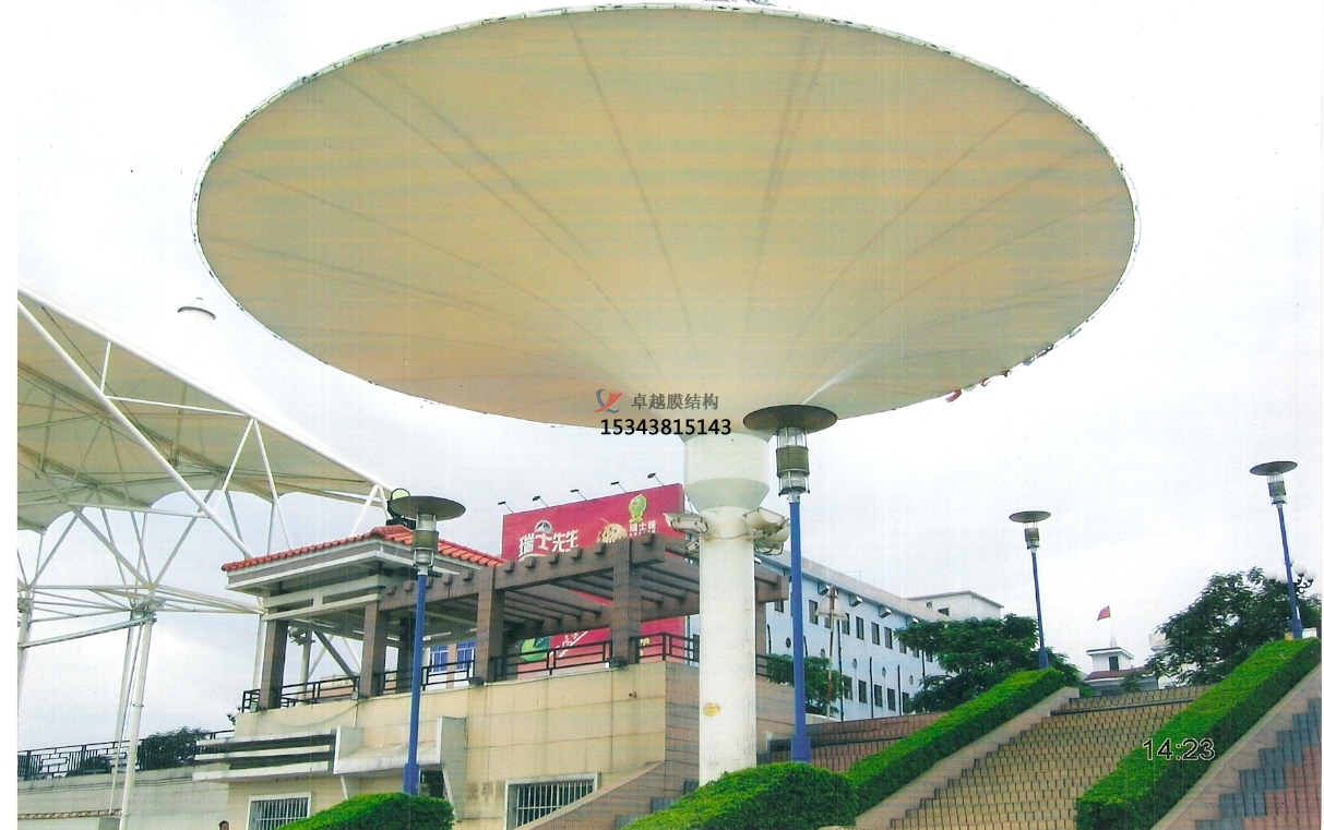 膜結(jié)構(gòu)遮陽(yáng)雨棚打破傳統(tǒng)純直線建筑風(fēng)格的模式,以其獨(dú)有的優(yōu)美曲面造型,簡(jiǎn)潔、明快、剛與柔、力與美的完美組合,給建筑師提供有更大的創(chuàng)造空間。