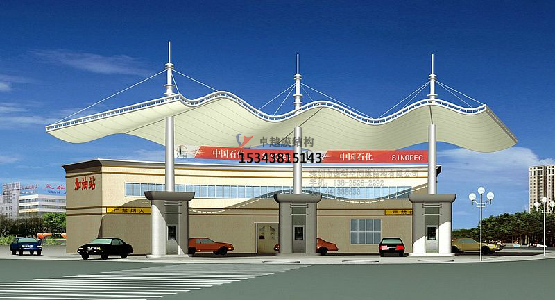 加油站罩棚是加油站的重要組成部分,設(shè)計(jì)加油站罩棚不僅僅要具有牢固、省電、防水等功能,還要美觀大方呢。膜結(jié)構(gòu)輕巧、別致的造型在停車場(chǎng)及候車廳的建設(shè)中擔(dān)當(dāng)了重要角色,除了滿足防風(fēng)雨、防日曬等基本功能外,并有較好的標(biāo)識(shí)招攬效果,展現(xiàn)了人們個(gè)性化的一面。