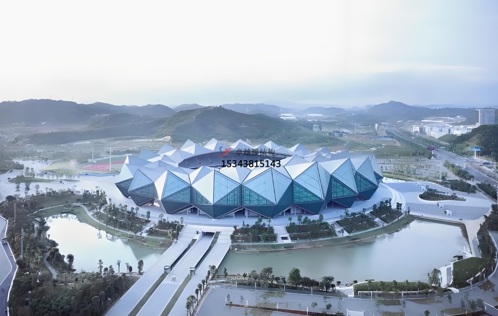 深圳大運會體育中心一場兩館采用空間折板結(jié)構(gòu),外觀類似“鉆石”。外層采用陽光板及玻璃幕墻,內(nèi)層采用透光率高、吸音率強、自潔性能好的網(wǎng)格內(nèi)膜材料。深圳大運會體育中心的網(wǎng)格內(nèi)膜面積超過10萬平方米。