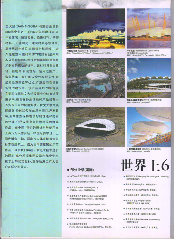 圣戈班工業(yè)薄膜為市場提供高性能聚合物薄膜、微孔過濾膜、薄膜圖層、復合薄膜和壓敏膠帶等多種產品近40多年,在相關行業(yè)中具有領先的地位。在諸多建筑中,我們都能看到圣戈班的影子,其中就有被很好的建筑師青睞的PTFE的建筑膜,實際上它就是圣戈班SHEERFILL®建筑網格布。