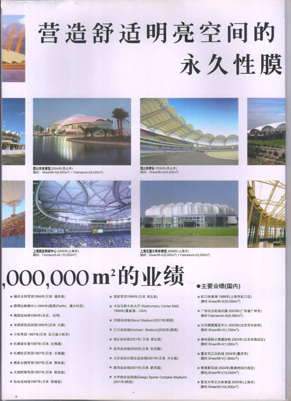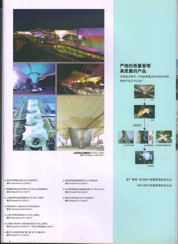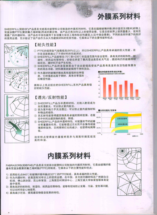 SHEERFILL產品能夠在-70C到+230C的溫度范團內安全使用。具有良好的耐熱性、耐濕性、耐藥品性等特性,即使在承受了暴風雪這類惡劣天氣后,膜結構仍然能維持初始狀態(tài),膜材料不會產生松弛。