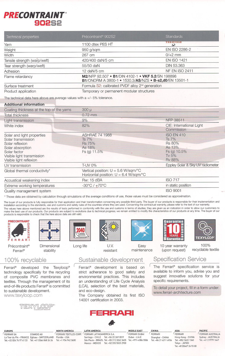 法拉利膜材十多年來,法拉利(PVDF)表面處理的復(fù)合膜材被應(yīng)用在全世界重要的織物建筑工程中?,F(xiàn)在,第代膜材再次確認(rèn)了這一出眾材料性能的更新發(fā)展。法拉利研發(fā)了第代材料正是為了滿足建筑師和業(yè)主在新世紀(jì)之初對于織物建筑提出的要求。這一 全新的膜材得益于更新的科研技術(shù),即將PVDF和硬化介體完美地結(jié)合。這種特殊的結(jié)合明顯地提高了材料的機(jī)械強(qiáng)度、使用壽命,并能長期保持織物建筑的原始 美觀。第代膜材在積累了10多年的經(jīng)驗(yàn)的基礎(chǔ)上,可以提供專業(yè)保證。法拉利現(xiàn)在能夠根據(jù)要求和每個(gè)項(xiàng)目的具體情況,提供12年質(zhì)量保證 (PRECONTRAINT702除外)。