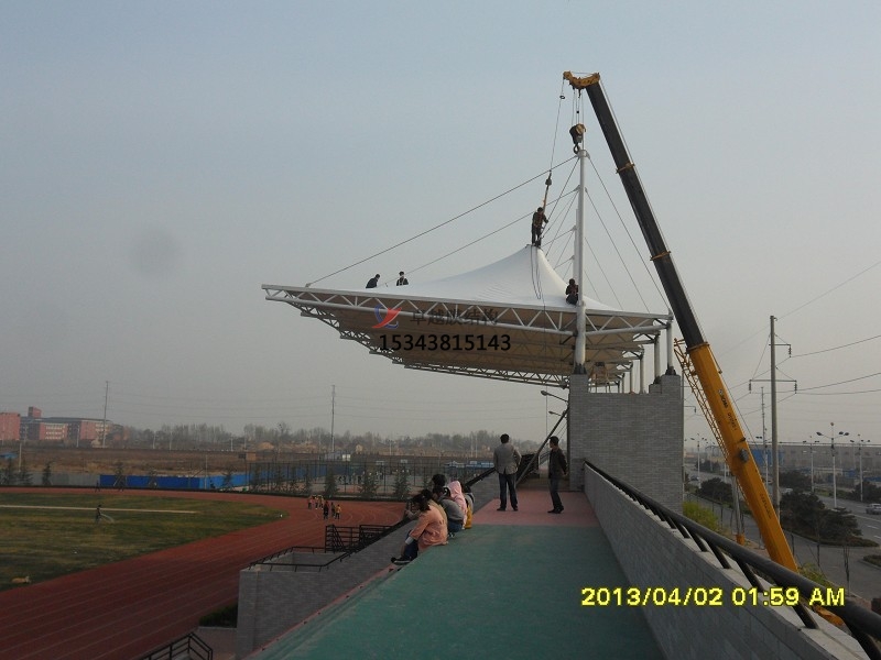 膜片的裁剪制作、鋼索及鋼結(jié)構(gòu)等制作均在工廠內(nèi)完成,可與下部鋼筋混凝土結(jié)構(gòu)或構(gòu)件等同時進行,在施工現(xiàn)場只是鋼索、鋼結(jié)構(gòu)及膜片的連接安裝定位及張拉的過程,故在現(xiàn)場的施工安裝比較文明、迅速快捷。