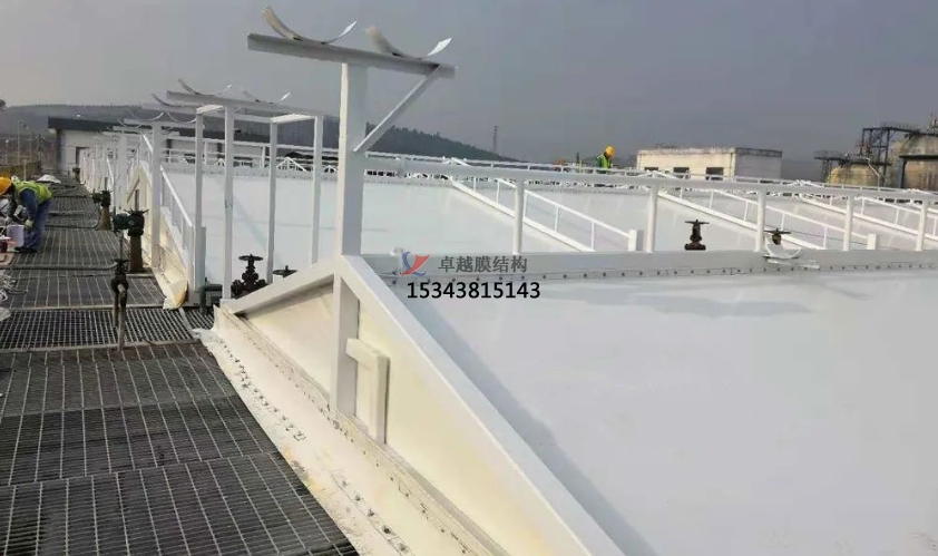 污水處理池加蓋,也稱反吊膜封閉,與常規(guī)建筑膜結(jié)構(gòu)不同之處在于,鋼構(gòu)在外部做支撐結(jié)構(gòu),膜材安裝在內(nèi)部做防護(hù)密閉,此類膜材采用污水池專用材料,具有防腐蝕、抗老化、免維護(hù)、美觀耐久、經(jīng)濟(jì)適用等優(yōu)點(diǎn)。