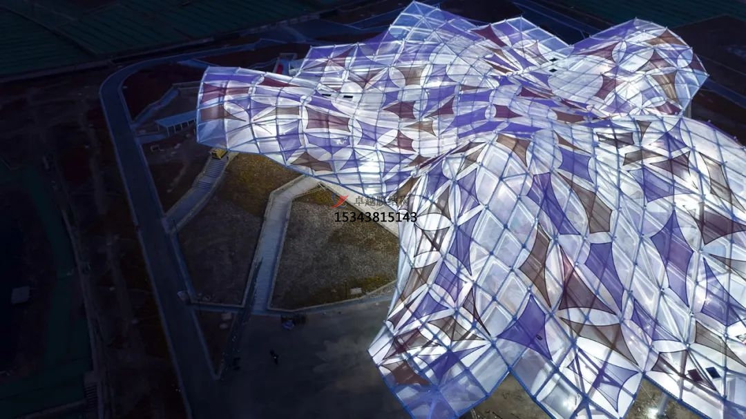 7、對(duì)轉(zhuǎn)角和褶皺區(qū)域進(jìn)行局部張拉調(diào)整,固定膜面和節(jié)點(diǎn);完成雨水系統(tǒng)安裝和防水覆蓋;