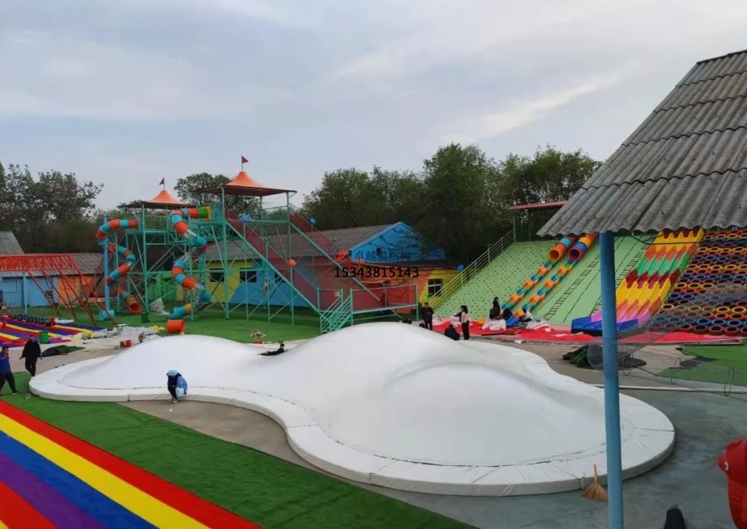 在現(xiàn)代游樂設施領域,蹦蹦云膜結構憑借其獨特的造型和創(chuàng)新設計,成為景區(qū)、親子樂園及商業(yè)空間的熱門選擇。這種以 “云朵” 為靈感的互動裝置,不僅為兒童提供了安全有趣的活動場地,更通過巧妙的結構設計與材料科技,重新定義了戶外游樂設施的美學與功能性。