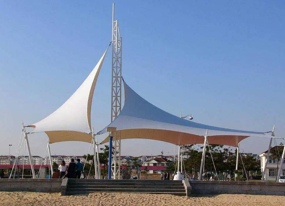 PVC膜材的強(qiáng)度及防火性與PTFE相比有些差距,但是其價格卻比PTFE膜材低很多,而且PVC膜材的使用年限一般在7到15年,是目前使用更多更廣泛的膜結(jié)構(gòu)材料。