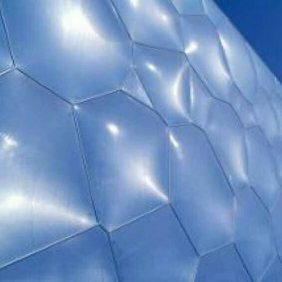 PTFE膜結(jié)構(gòu)材料更大的特點(diǎn)是強(qiáng)度高、耐久性好、防火難燃、自潔性好,不受紫外線影響,使用壽命在25年以上。具有高透光率,透光率為13%, 對(duì)熱能反射率73%,PTFE膜熱吸收量很少。正是因?yàn)檫@種劃時(shí)代的膜材料的發(fā)明,使膜結(jié)構(gòu)建筑成為現(xiàn)代化的永久性建筑。