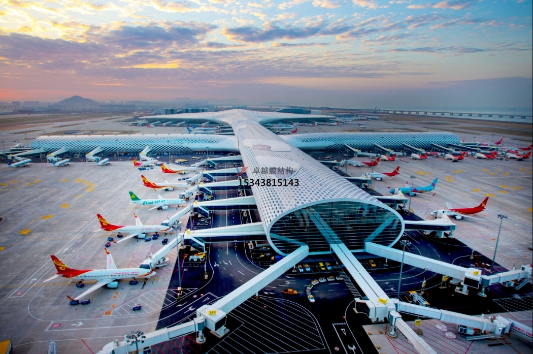 深圳寶安國際機場和北京大興國際機場,也使用不同形式的膜結(jié)構(gòu),分別是ETFE膜、PTFE和玻璃膜材料。其中機場航站樓的落地幕墻使用了PTFE膜材料,起到隔音、防紫外線的作用,同時讓建筑變得更加美觀。