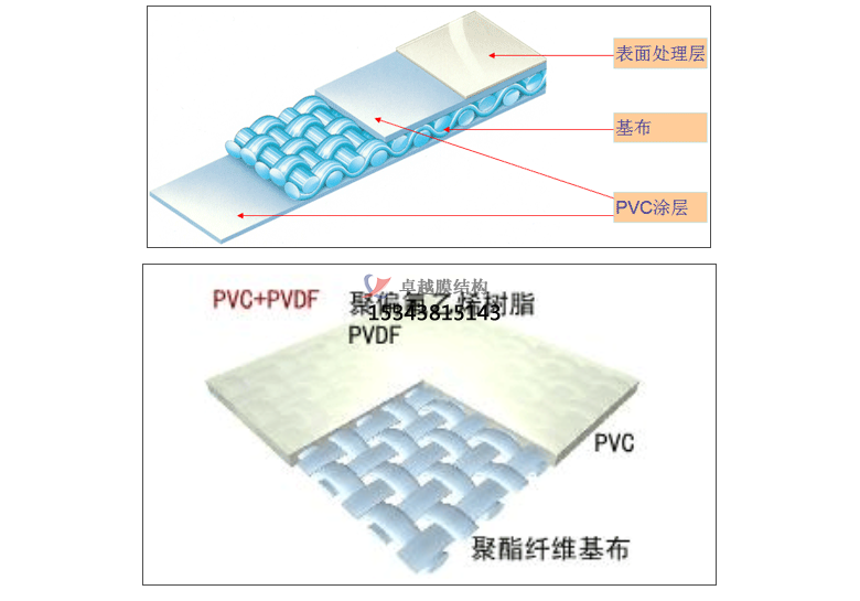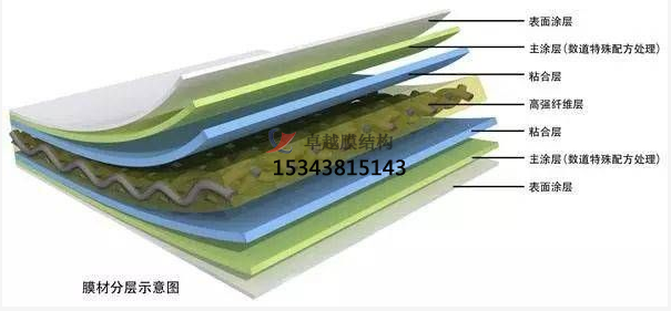 PVDF膜材加工是在聚酯纖維基布上涂上Pv(聚氬乙烯)樹酯后加上100%PVDF(聚偏氟乙烯)表面涂層而成的復(fù)合材料。PVDF膜權(quán)由于自潔性良好、價格適中、運(yùn)輸安裝方使,更廠泛應(yīng)用于各類建筑領(lǐng)域。它的壽命因不同的表面涂層而異,一股可達(dá)成10-25年,其構(gòu)造形式見下圖: