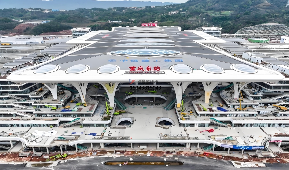 重慶東站:正在建設(shè)的重慶東站屋蓋體系采用了“管桁架鋼結(jié)構(gòu)+橢圓形天窗+樹形支撐柱+ETFE氣枕膜”形式。這種設(shè)計(jì)不僅實(shí)現(xiàn)了大跨度的覆蓋,還通過ETFE氣枕膜的應(yīng)用為整個(gè)項(xiàng)目增添了獨(dú)特的視覺效果。