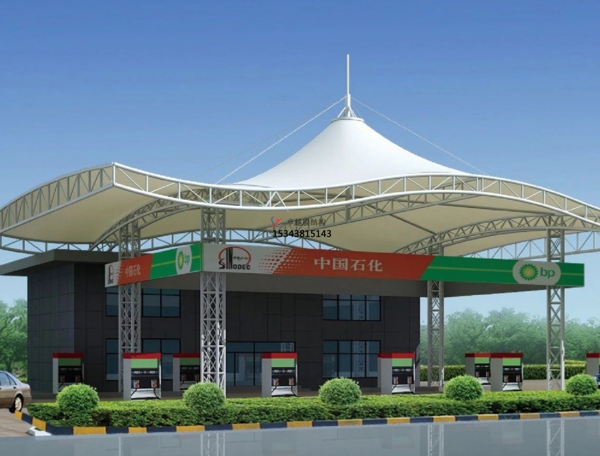 加油站的膜結(jié)構(gòu)適合采用的形式有:多點(diǎn)對稱拋物面、組合拋物面、馬鞍形拋物面錐形雙曲拋物面、拱支承型等等。膜結(jié)構(gòu)的鋼構(gòu)件、膜面及其它零配件都是工廠預(yù)制件,安裝方便,施工時(shí)間很短。非常適合工期緊,需要短時(shí)間投入運(yùn)營的加油站工程。
