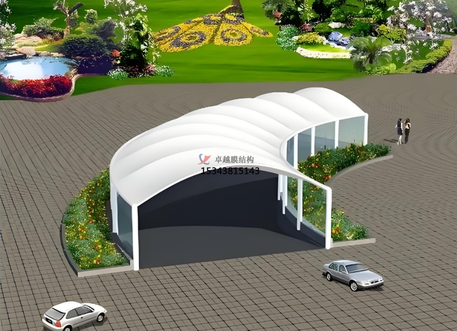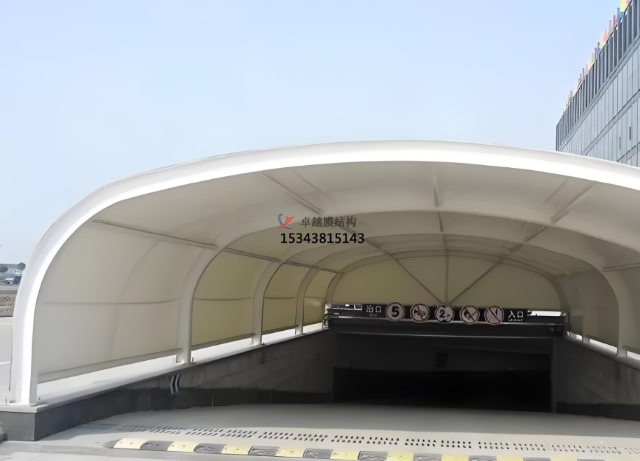 膜結構頂棚采用高強度膜材,能夠有效抵御紫外線、雨水和風雪的侵襲。對于車庫出入口來說,它可以避免車輛因長時間暴露在惡劣天氣中而受到損害,同時也能為行人提供一個安全、舒適的通行環(huán)境。