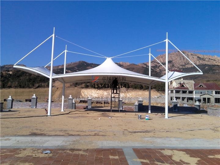 因?yàn)榫坝^膜結(jié)構(gòu)遮陽棚是由多種高強(qiáng)薄膜資料及加強(qiáng)構(gòu)件經(jīng)過必定方法使其內(nèi)部發(fā)生必定的預(yù)張應(yīng)力以構(gòu)成某種空間形狀,作為掩蓋結(jié)構(gòu),并能接受必定的外荷載效果的一種空間結(jié)構(gòu)方式。
