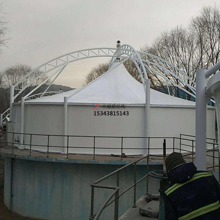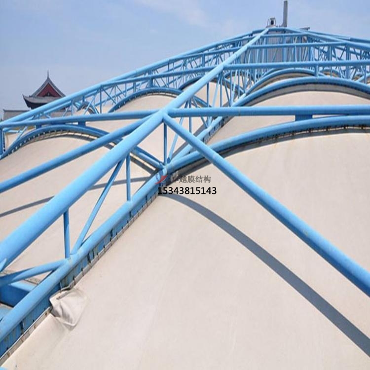 鋼架反吊膜結(jié)構(gòu)是專門(mén)用于污水池加蓋密閉的一種膜結(jié)構(gòu)形式,結(jié)構(gòu)形式新穎,防腐耐霉,由鋼結(jié)構(gòu)、膜結(jié)構(gòu)及安裝輔件構(gòu)成,根據(jù)不同污水池現(xiàn)場(chǎng)條件進(jìn)行個(gè)性化設(shè)計(jì)安裝。鋼結(jié)構(gòu)在外部形成穩(wěn)定受力結(jié)構(gòu),膜材料反吊與機(jī)構(gòu)內(nèi),隔絕廢氣對(duì)剛架構(gòu)的腐蝕。鋼架反吊膜分為圓形反吊膜和方形反吊膜,其中方形反吊膜又分為拱形及吊帽結(jié)構(gòu)。