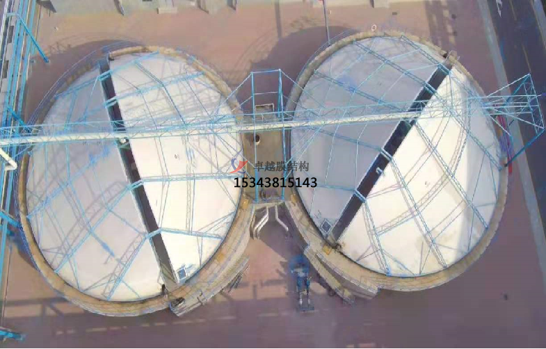 雙膜密封罩結(jié)構(gòu)是污水池上加蓋的一個氣囊,它由上下兩層氟碳纖維膜焊接而成,通過周邊與污水池池壁錨固,形成一個穩(wěn)定的受力結(jié)構(gòu),起到污水池內(nèi)惡臭氣體密閉的效果。雙膜密封罩結(jié)構(gòu)的優(yōu)點是結(jié)構(gòu)牢固、密封性好、防止水溫升高或降低,適用于工業(yè)水曝氣池或市政污水池。