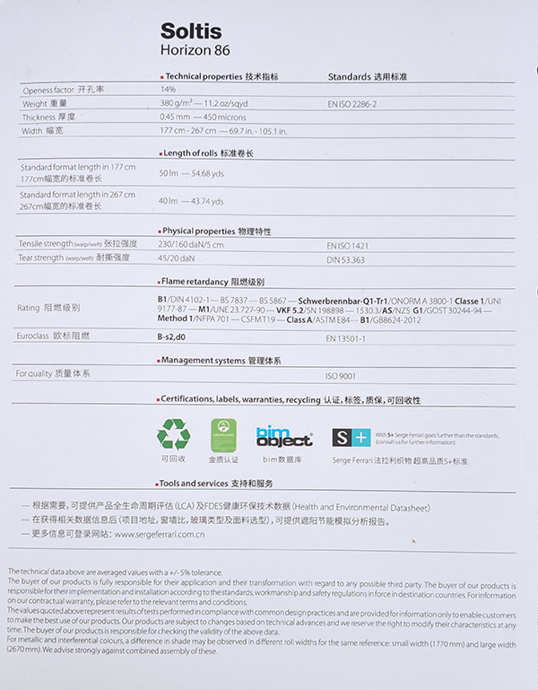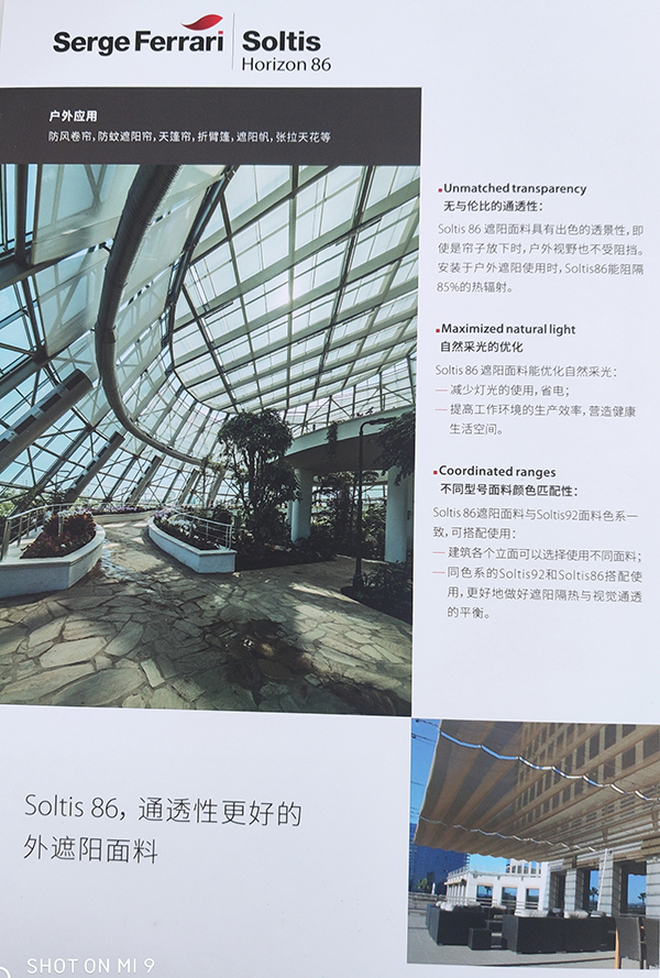紗帝飾:紗帝飾面料為抵擋熱量和光線的真正盾牌,依靠其微型通風(fēng)結(jié)構(gòu),調(diào)節(jié)陽光的熱效應(yīng),有效地防眩目。紗帝飾面料具有46種顏色,可為所有建筑,無論是 公眾場合還是私人住宅提供配套的眾多色彩和多種用途。法拉利預(yù)應(yīng)力專利制造技術(shù)給紗帝飾織物帶來尺寸恒定,不會變形,無需加固自然抗撕拉,耐久和抗塵,占 地面積小等獨(dú)有特性,更顯出紗帝飾面料對建筑物技術(shù)性遮陽無可匹敵的優(yōu)勢。