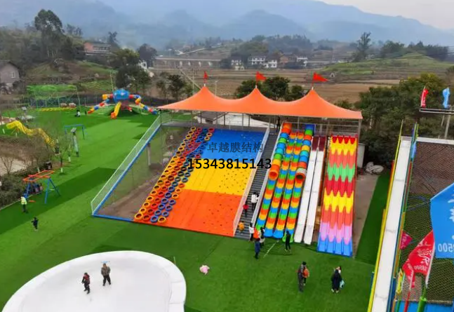 色彩鮮艷:張拉膜結構采用高強度材料制成,表面涂有彩色涂層,可以呈現(xiàn)出絢麗多彩的效果,為游客帶來更加豐富的游玩體驗。